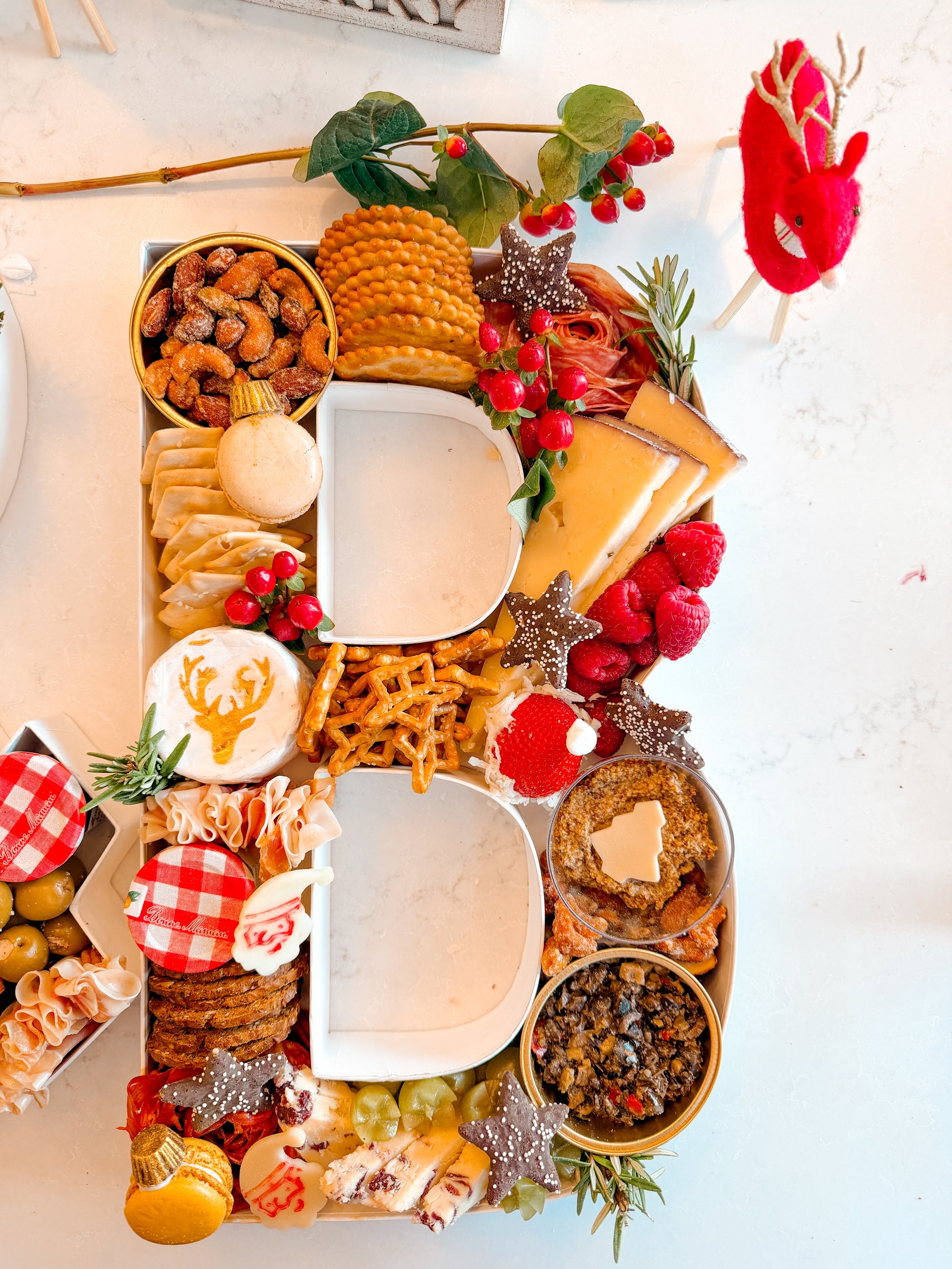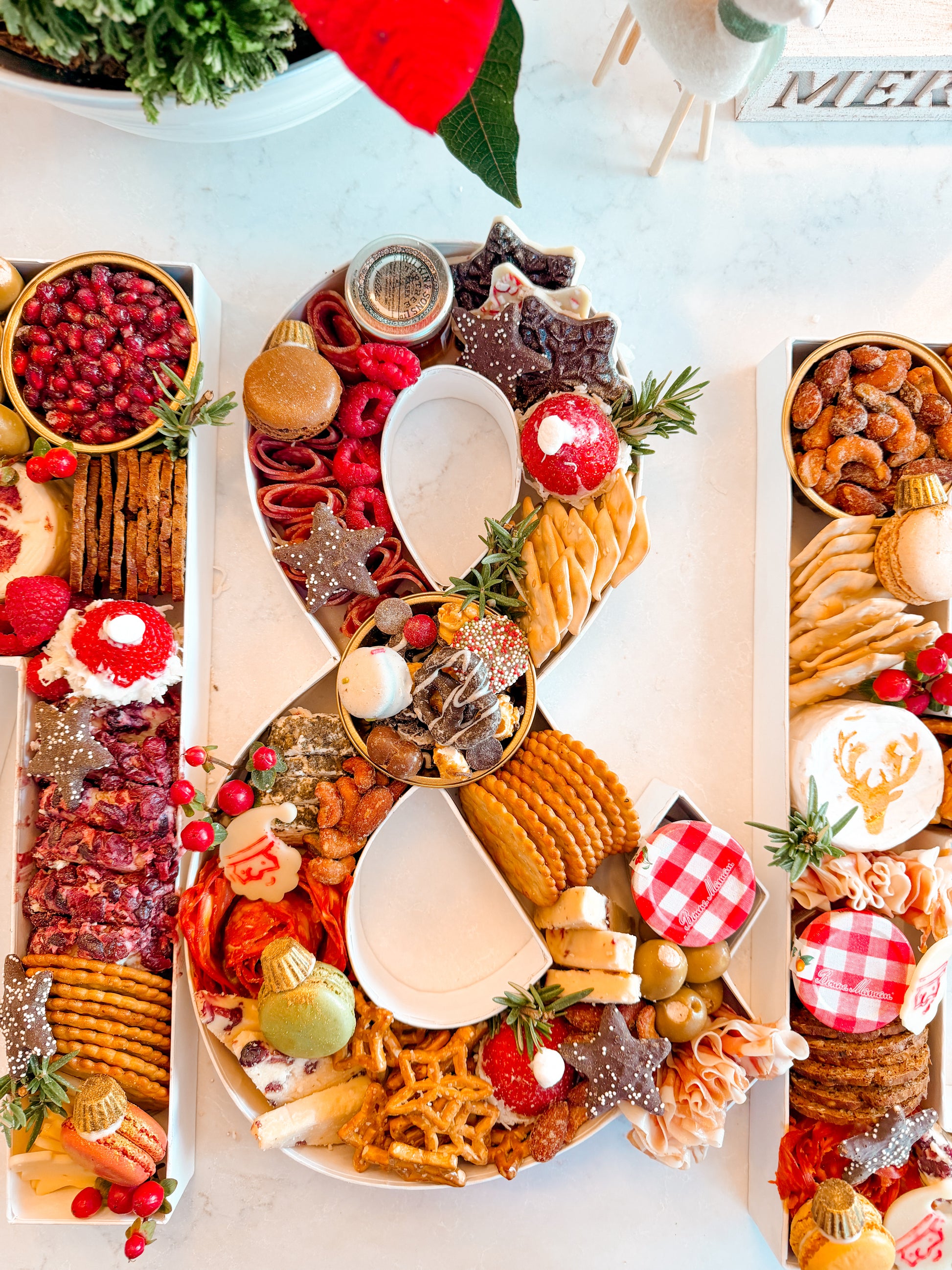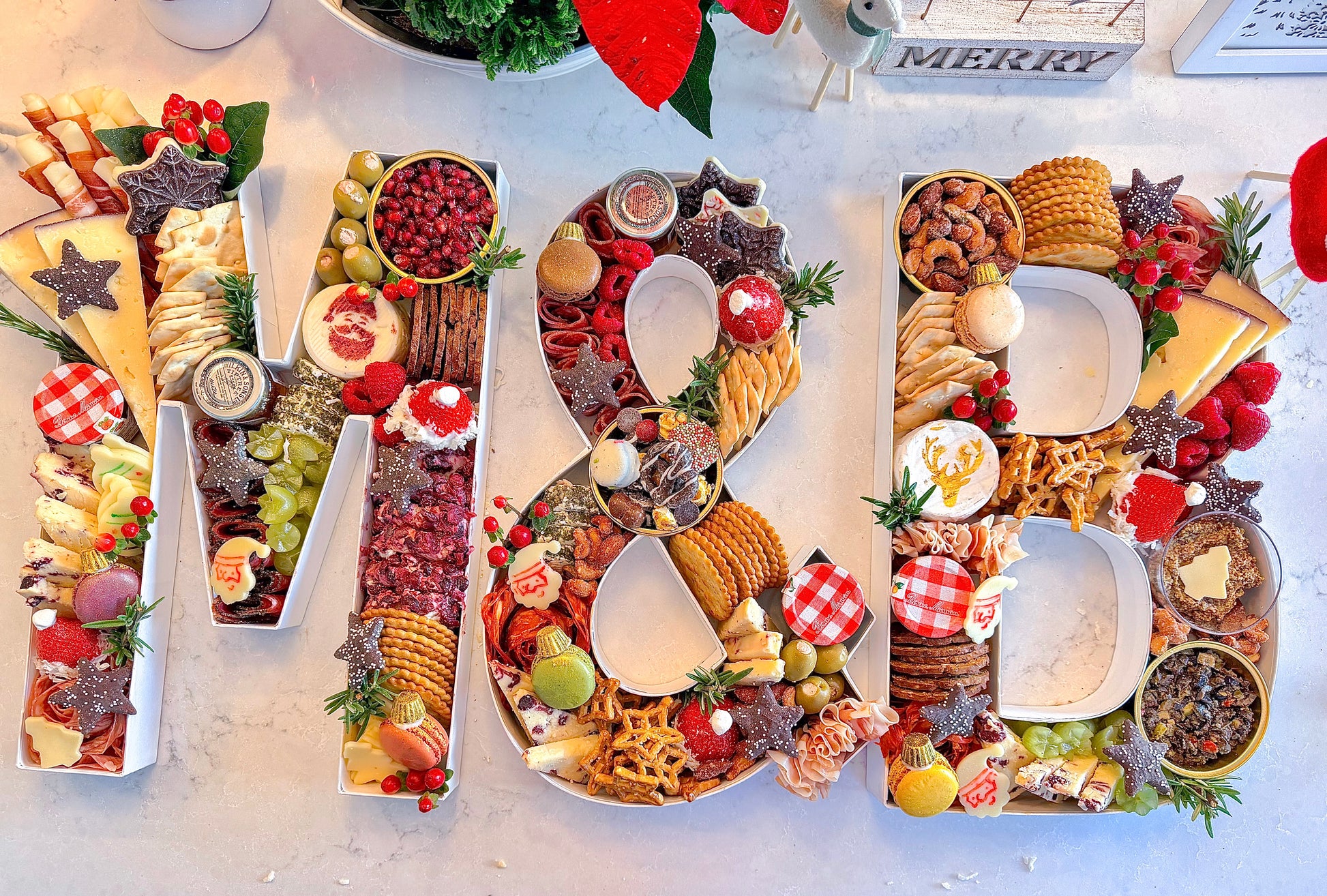 Every letter or number is designed to create a wow moment, styled with pops of holiday greenery, chocolate stars, berries, rosettes, mini jams, macarons, and other signature Snacktivity Queen details. Whether it’s a milestone age, initials, or a full name, these boards make any celebration unforgettable.