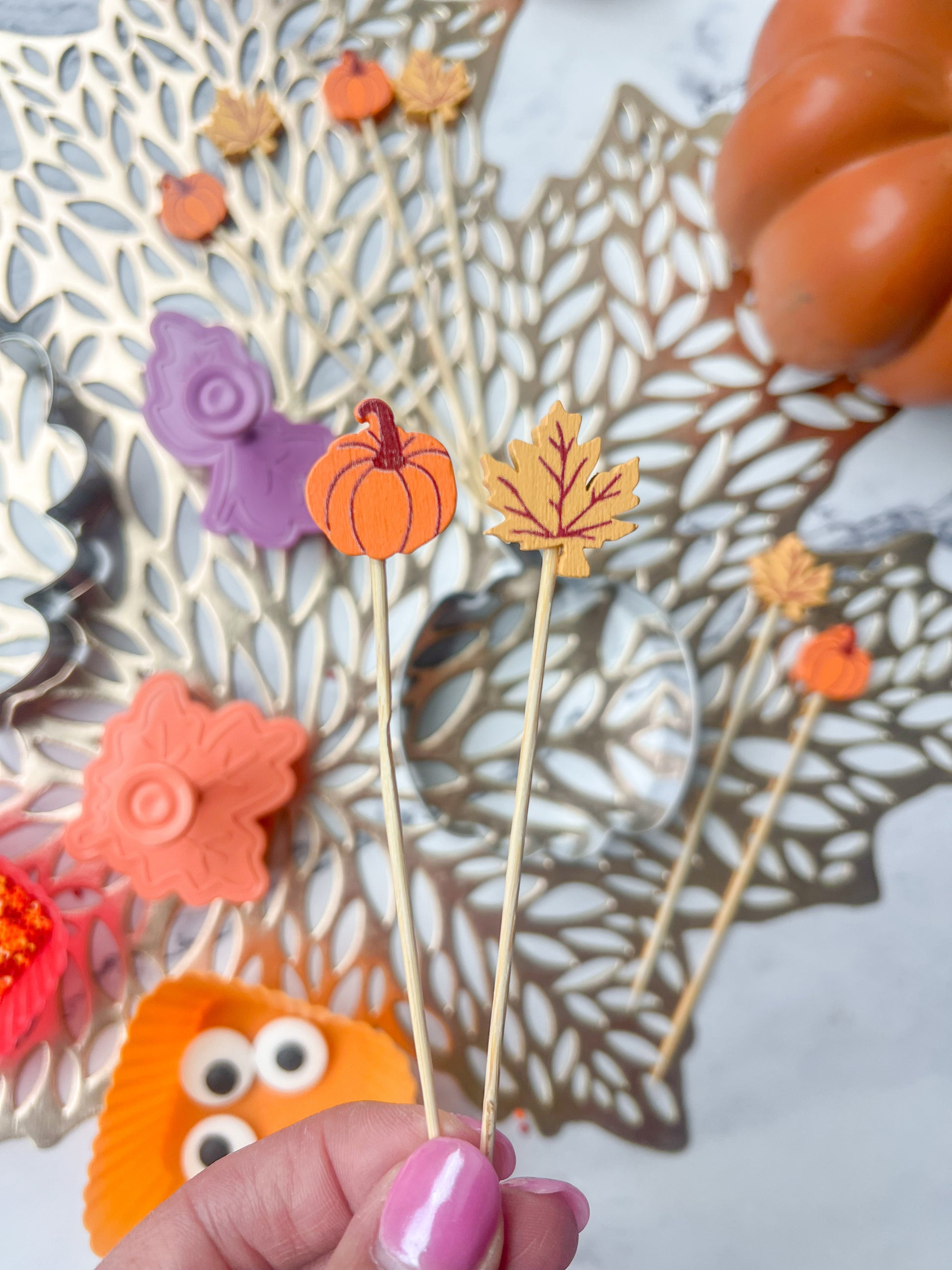 Large Kit Includes: two seasonal cutters (pumpkin, two leaf designs), two food stamps (one of four leaf designs), four autumn silicone liners for dips, fruits, & nuts, seasonal confetti & sprinkles, four sets of candy eyes & eight fall skewers