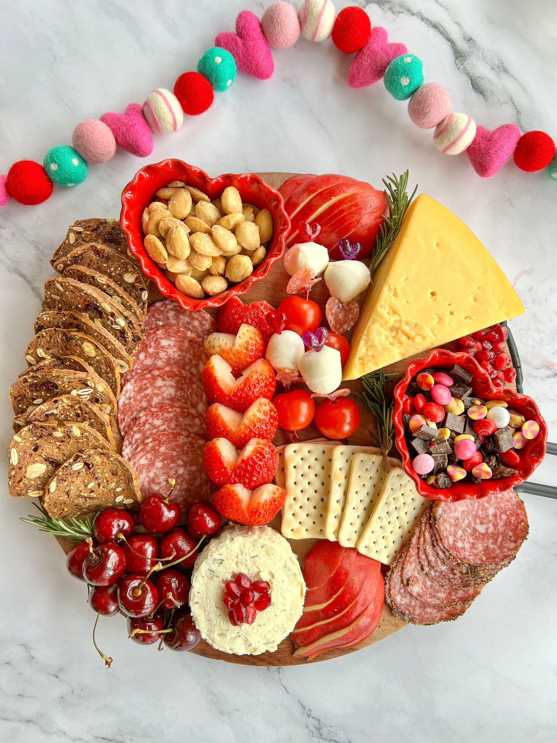 Share the love with this festive platter, overflowing with Valentine-themed treats that blend sweet and savory into one irresistible spread. From heart-shaped cheeses and strawberries, charcuterie meats, fresh fruits, crackers, candies, and decadent chocolates, every bite is designed to celebrate the season of love. Pops of red, pink, and white make the board as beautiful as it is delicious—perfect for gifting, date nights, girls night, or family valentine celebration!
